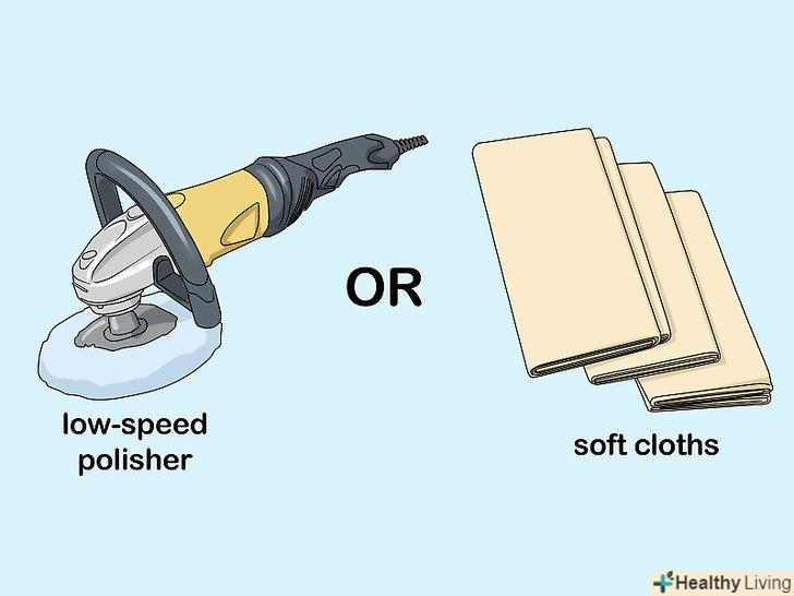 Використовуйте низькошвидкісну полірувальну машину або м'яку ганчірку. підійдуть обидва варіанти, хоча робота з ганчіркою займе більше часу, і якщо ви не зможете прикладати однаковий тиск, це негативно вплине на результати, так що надійніше використовувати низькошвидкісну полірувальну машину.- Якщо у вас є дриль, можна замінити свердло покритим повстю шліфувальним диском і використовувати її для полірування.