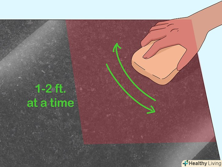 Обробляйте невеликі ділянки. поліруйте за раз невеликий відрізок довжиною 30-50 сантиметрів, щоб отримати однорідну поверхню і встигнути обробити мармур до того, як засіб для полірування висохне або почне збиратися в грудки. Крім того, робота з невеликими ділянками допоможе вам рівномірно розподіляти засіб для полірування, так як ви зможете потроху додавати його в міру просування. [10]- Почніть з кута і просувайтеся по всій площі, щоб рівномірно відполірувати її. Якщо ви почнете з середини, то ризикуєте пропустити окремі ділянки.