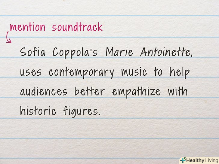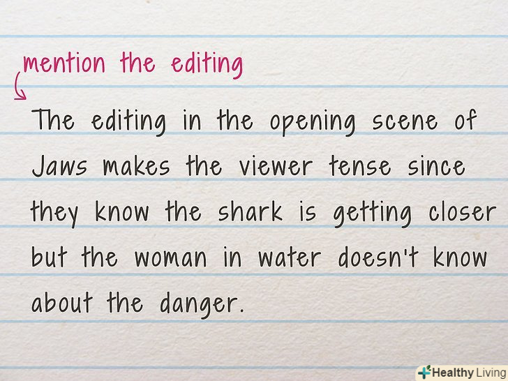 Оцініть вплив звукових ефектів і музики на настрій сцени.можна закрити очі і зосередитися на музиці зі звуковими ефектами. Потім перегляньте сцену знову вже з відкритими очима, щоб зіставити звуки з монтажем і діями персонажів. Помічайте, як звуки впливають на загальний настрій, який створюється іншими елементами обраної сцени.[12]- Наприклад, музика на початку фільмущелепи допомагає нагнітати напругу, оскільки вона прискорюється до самого моменту нападу акули.