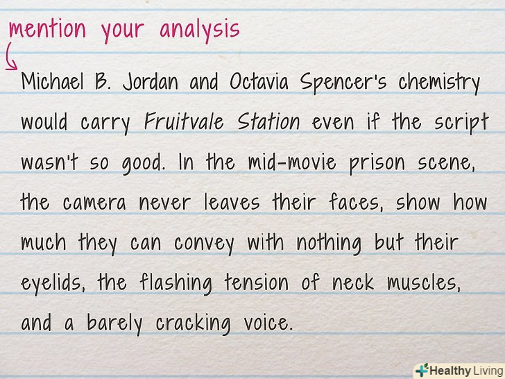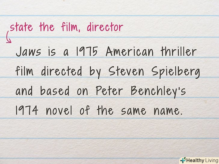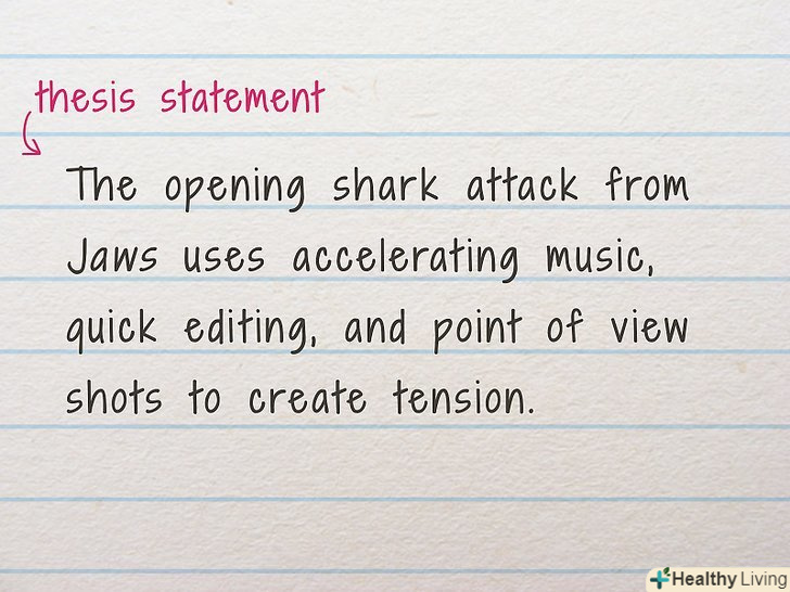 Обміркуйте тезу, яка стане основною ідеєю аналізу.вивчіть свої нотатки та порівняйте їх із загальною темою фільму. Виберіть тему для аналізу, яку можна аргументувати кількома елементами сцени, щоб розкрити і довести свою точку зору. Ваша теза повинна складатися з одного короткого речення.[13]- Наприклад, для початкової сцени з фільмущелепи можна написати таку тезу: «напад акули в початковій сцені фільмущелепи супроводжується прискореною музикою і короткими кадрами з позиції різних дійових осіб і об'єктів, щоб посилити напругу».