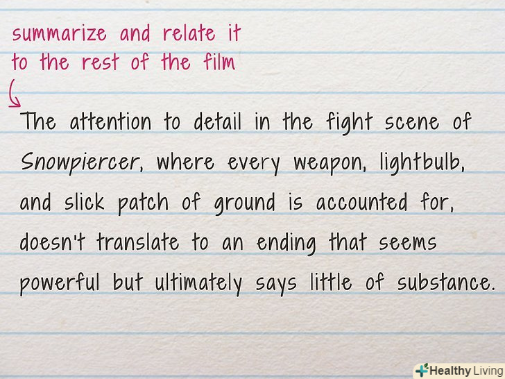 Коротко опишіть сцену і зв'язок епізоду з рештою фільму.у наступному абзаці необхідно описати події, що відбуваються в хронологічному порядку, щоб читач розумів, про що йде мова. В кінці абзацу використовуйте 1-2 речення, щоб розглянути місце сцени в подіях і темі всього фільму.[15]- Обсяг даного абзацу повинен становити 4-5 речень.
