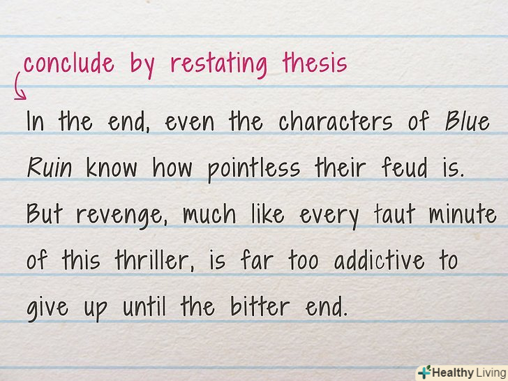 Завершіть роботу повторенням тези та основних ідей есе.Перефразуйте свою тезу, щоб заново сформулювати основну ідею роботи в першому реченні заключного абзацу. Потім в 2-3 пропозиціях резюмуйте ідеї, які були розглянуті в основній частині вашої роботи. Завершіть абзац реченням, яке залишить незабутнє враження щодо обраної тези, щоб читач усвідомив цінність аналізу.[17]- Наприклад, можна завершити аналіз початкової сцени фільмущелепи думками про вплив даної сцени на весь жанр фільмів жахів.