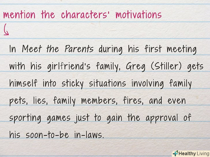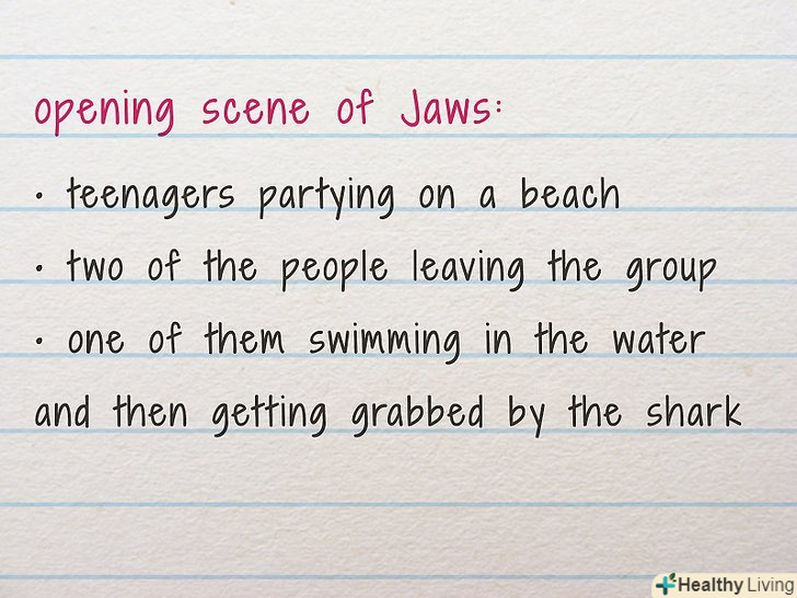 Коротко перекажіть основні дії, які відбуваються на екрані.запишіть події сцени в порядку демонстрації глядачеві, щоб мати загальне уявлення про те, що відбувається. Разом з подіями вкажіть теми розмов персонажів. Необхідно перерахувати дії і події, які просувають сцену вперед, а не описувати кожен окремий кадр.[4]- Наприклад, в початковій сцені фільмущелепи на пляжі веселяться Підлітки, двоє з них відокремлюються від групи, один відправляється плавати і стає жертвою акули.