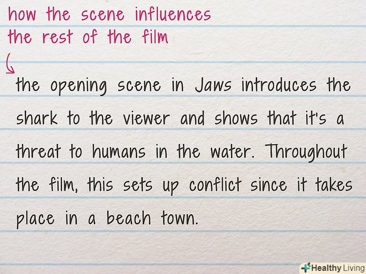 Визначте місце сцени в сюжеті фільму.Погляньте на сцену під більш широким кутом, щоб зрозуміти її вплив на решту фільму. Зверніть увагу на попередню і подальшу сцени. Запишіть важливу інформацію зі сцени, яка пізніше виявиться важливою або вплине на тему фільму.[5]- Наприклад, в початковій сцені фільмущелепи глядачі знайомляться з акулою і бачать, що вода таїть загрозу для людей. Події фільму відбуваються в курортному містечку, тому сцена задає конфлікт.