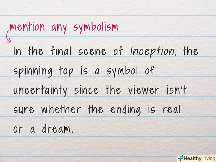 Помічайте символізм сцени.символами у фільмі можуть виявитися звукові або візуальні підказки, які співвідносяться з емоціями, настроєм або діями. Знову перегляньте сцену і зверніть увагу на важливий реквізит або повторювані кадри. Напишіть про все, що ви змогли помітити, а потім обміркуйте значення таких образів для сцени і навіть для всього фільму.[7]- Наприклад ,в останній сцені фільмуПочаток дзига, що крутиться, висловлює невпевненість, оскільки глядач не впевнений, є або кінцівка реальністю або сном.
