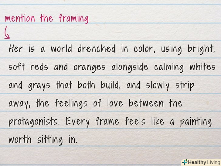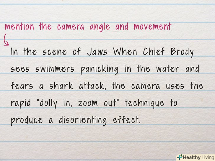 Аналізуйте кут нахилу і руху камери, щоб зрозуміти настрій сцени.Ракурс камери визначає, що можна побачити в кадрі, а також виділяє об'єкти, на яких глядачеві слід зосередитися. Вказуйте часті рухи або нерухому позицію камери, адже такі нюанси впливають на загальний настрій і напругу сцени. Проаналізуйте, як заповнений кадр сцени, а також зверніть увагу на кількість великих і загальних планів.[10]- Наприклад, екшен-сцени зазвичай включають багато рухів і знімаються з різних ракурсів, щоб розважати глядача. На противагу лякаючі сцени часто знімають крупним планом нерухомою камерою, щоб глядач відчув напругу.
