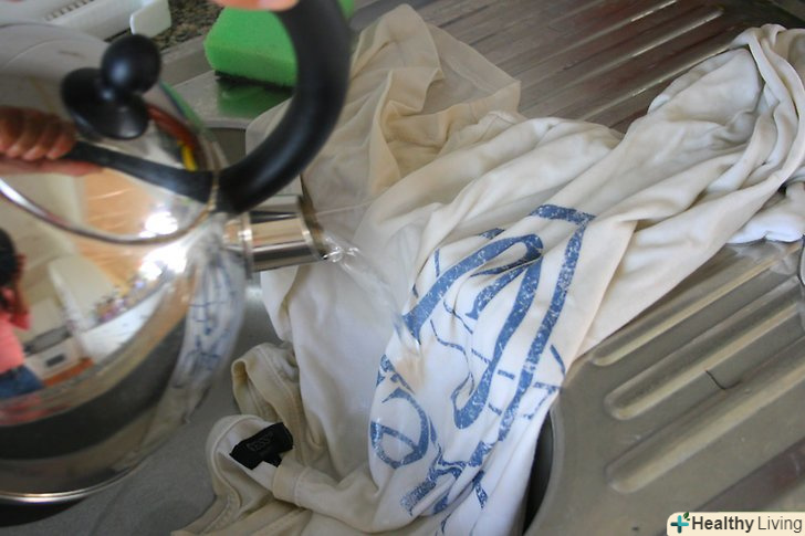 Поливайте віск киплячою водою, яка повинна збігати в раковину або миску, але не потрапляти на іншу частину одягу.