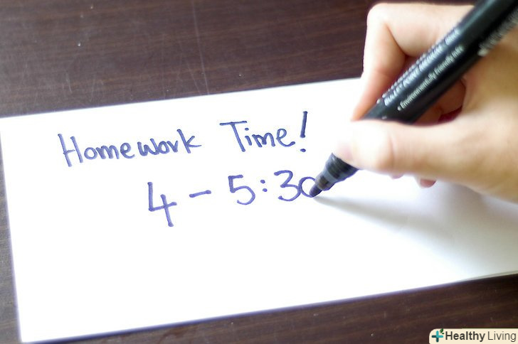 Встановіть певний час для виконання домашніх завдань дітьми. хоча строго розписати кожен день неможливо, намагайтеся дотримуватися встановленого порядку, щоб діти точно знали свій розклад, що відбувається в який час, і знали, чого від них очікують. Виберіть годинник, який ви зможете дотримуватися більшість вечорів, і присвятіть їх урокам. Вимкніть телевізор і усуньте всі інші відволікаючі моменти, щоб ваші діти могли сконцентруватися на навчанні. Відразу після вечері для цього дуже вдалий час. Діти можуть сісти за стіл, поки ви прибираєтеся після вечері. Ви можете провести час разом і одночасно робити свої справи, також як і відповісти на будь-які їхні запитання.