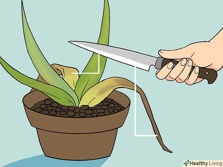 Видаляйте відмерлі листя. гострим стерилізованим ножем обрізайте такі листя біля основи. Відмерлі листя забирають поживні речовини У інших частин рослини, тому не забувайте видаляти їх, щоб алое вера нормально розвивалося. [32]