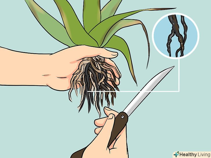 - Якщо ви виявите, що більшість коренів пошкоджені, доведеться зробити більше зусиль, щоб зберегти рослину, якщо його взагалі можливо врятувати. В цьому випадку можна спробувати зрізати ножем найбільші листя. Обріжте приблизно половину рослини. Це досить ризикований метод. Проте, чим менше листя залишиться, тим краще неушкоджені коріння зможуть забезпечувати рослину поживними речовинами. [8]