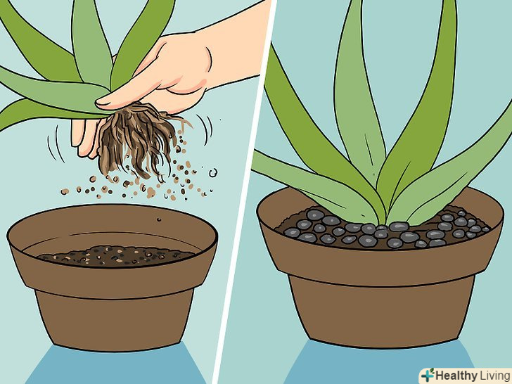 Пересадіть алое вера. засипте в горщик грунтову суміш і злегка струсіть алое вера, щоб видалити з клубка коренів приблизно третину грунту, яка пристала до нього. [18] посадіть рослину в новий горщик і засипте коріння грунтовою сумішшю. Простежте, щоб під грунтом виявився весь клубок коренів, проте не насипайте землю вище, ніж це було в попередньому горщику. [19]- Можна також викласти поверх грунту невеликі камінчики або гравій — так вологи буде випаровуватися менше. [20]