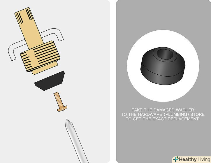 Дістаньте кран буксу і відкрутіть гвинт, який тримає прокладку. Візьміть цю прокладку з собою в магазин і підберіть таку ж нову.