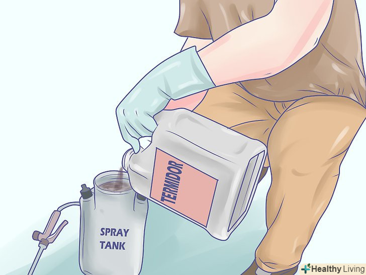 Використовуючи розпилювальний бак, обробіть Термідором ті місця фундаменту будинку, які прилягають до грунту (ці місця також називаються фундаментними балками).- Розпилюйте 5 літрів підготовленого розчину термідора на кожен квадратний метр оброблюваної площі грунту або підлоги.