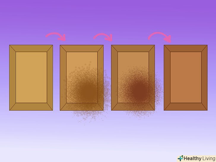 Наносите шелак смугами. при обробці кожної смуги, стежте, щоб кромка губки була вологою, працюйте швидко з кожної деревної поверхнею, роблячи одночасно одну смугу.- Починайте від одного кінця дерев'яної поверхні і швидко по ній працюйте, стежачи, щоб губка при нанесенні смуг була завжди змочена шелаком.