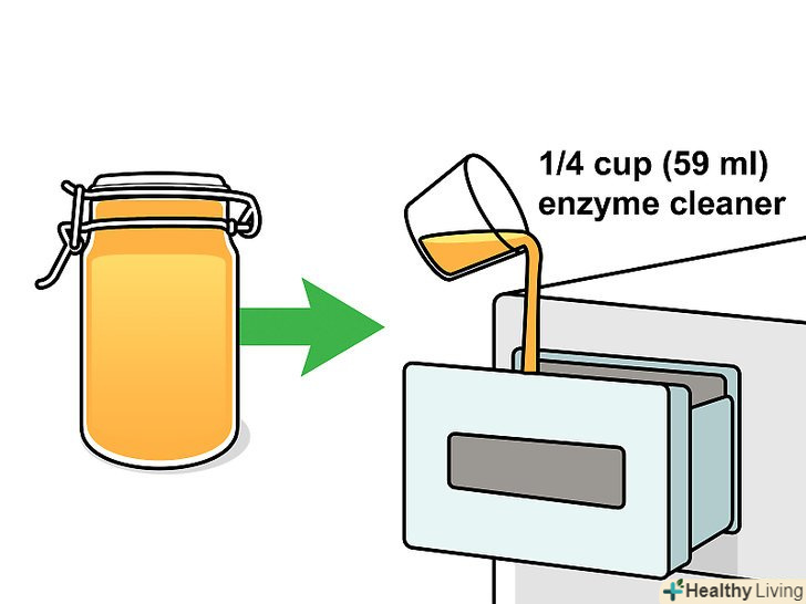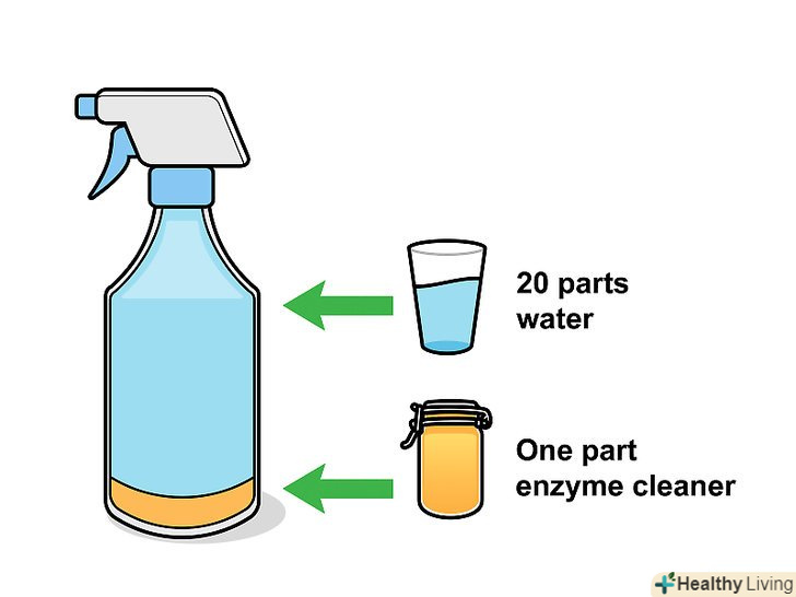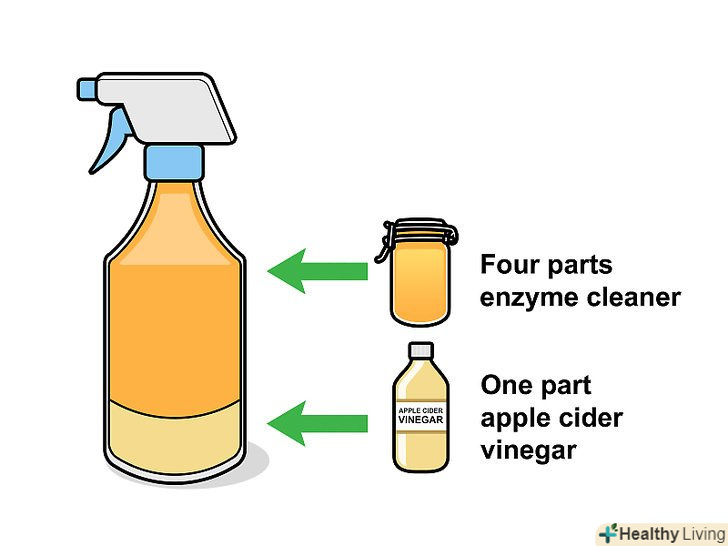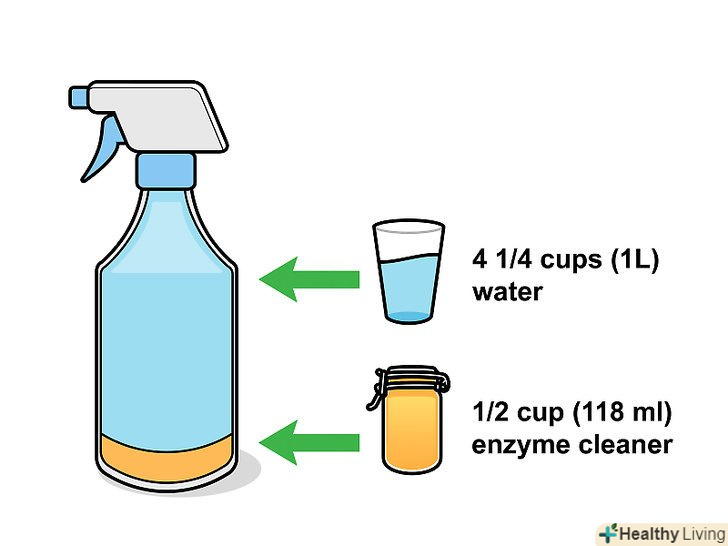 Приготуйте універсальний миючий засіб. відміряйте півсклянки (120 мл) ферментного очищувача і перелийте його в чистий пульверизатор. Туди ж вилийте 4¼ склянки (1 л) води. Закрутіть носик і струсіть пляшку, щоб гарненько перемішати очищувач з водою. Струшуйте пляшку перед кожним використанням очищувача.- Цей універсальний очищувач можна використовувати на всіх поверхнях: для очищення ванних кімнат, килимів, кухонь, незначних плям, а також в інших цілях. [8]