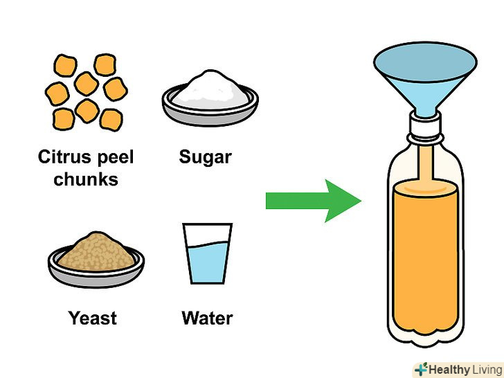 Змішайте інгредієнти. вставте воронку з широкою горловиною в отвір чистої дволітрової пляшки для газованих напоїв. Неспішно висипте кубики шкірки, поки вони все не виявляться в пляшці. Туди ж додайте цукор, дріжджі і воду. Приберіть воронку і щільно закрутіть кришку. Струшуйте пляшку протягом декількох хвилин, поки весь цукор не розчиниться. [2]- Для цього рецепта дуже важливо використовувати саме пляшку для газованих напоїв, оскільки вони призначені для рідин, що знаходяться під тиском.