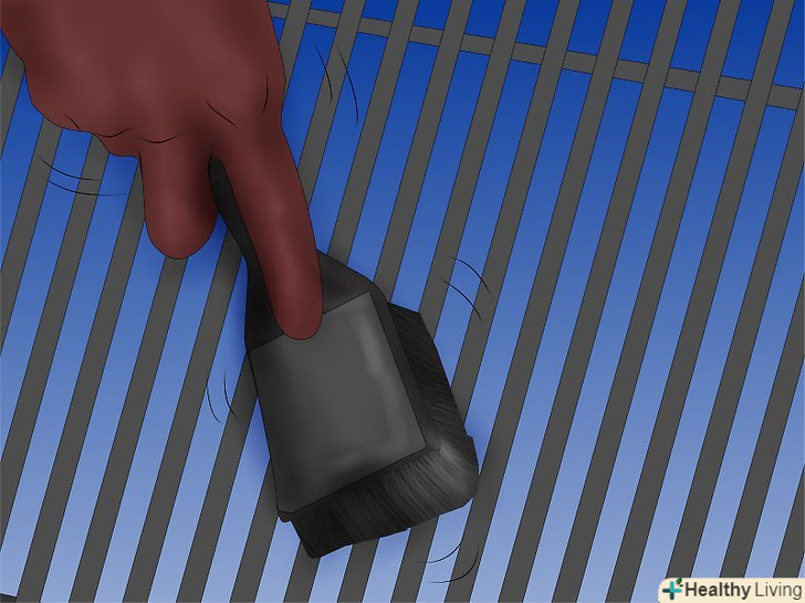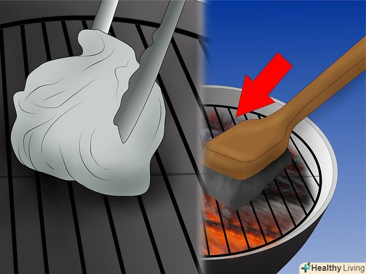 Почистіть решітку. візьміть щітку для гриля з довгою ручкою (бажано з жорсткою дротяною щетиною) і почистіть решітку, усуваючи всі прилиплі частинки. Якщо немає щітки, можете почисти гриль м'ятою алюмінієвою фольгою, затиснутою в довгих щипцях. [2]- Чистіть гриль, усуваючи жир, прилип маринад, спеції і розплавлений сир, який міг просочитися крізь підсмажену їжу.