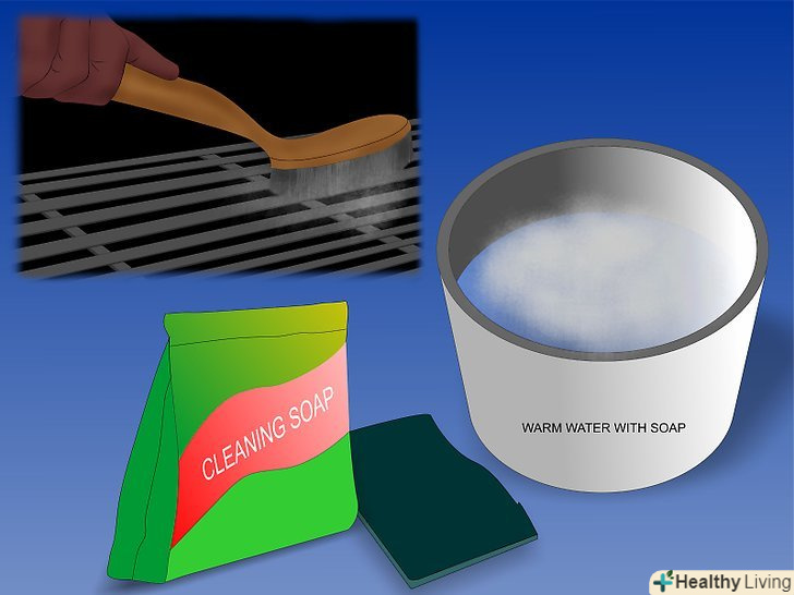 Спаліть жир і сміття. покладіть брикети, закрийте кришку і нагрівайте гриль до максимальної температури протягом 15 хвилин. Це відокремить весь жир з решітки, так, мити його буде легше.- Нехай гриль постоїть і охолоне 10-15 хвилин, після цього приберіть грати і брикети для готування. Помийте решітку в мильній воді, використовуючи щітку для гриля, щоб прибрати весь прилип жир. Дротяна губка також може бути використана, щоб усунути прилип бруд.