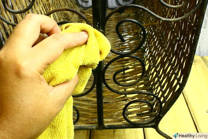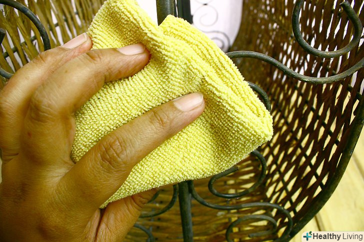 Протирайте виріб з кованого заліза круговими рухами, працюючи на невеликих ділянках, видаляючи весь пил і бруд. у міру необхідності змочуйте губку або ганчірку.- Якщо є іржа на виробі з кованого заліза, спробуйте очистити її металевою щіткою або грубим наждачним папером.