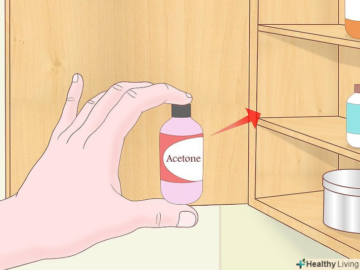 Зберігайте ацетон у безпечному місці. Ацетон є легкозаймистою речовиною. Тримайте його подалі від електричних розеток або інших предметів, які можуть спровокувати його займання. [6]- Переконайтеся, що ємність з ацетоном щільно закрита кришкою, і він не контактує ні з чим, що може привести до його загоряння.