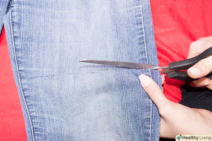 Знайдіть стару пару джинсів. поки верхня частина джинсів все ще знаходиться у відмінному стані, нижня частина не має значення. Джинси з дірами на колінах і потертими кінцями є ідеальним вибором.