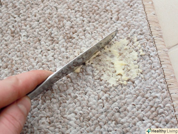 Промокніть пляму змоченим в теплій воді паперовим рушником. Папір вбере рідкий жир або масло, і на килимі залишиться сухе сміття, який можна буде видалити пилососом.