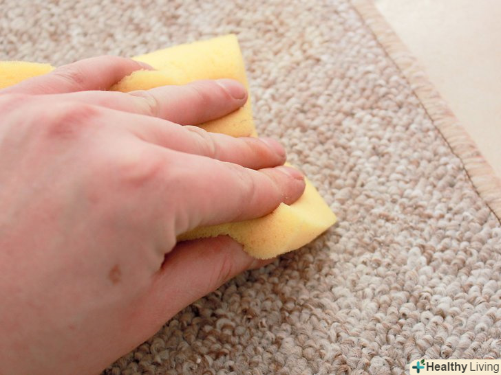 Промокніть килим м'яким миючим засобом. змочіть залишився пляма м'яким миючим засобом і почекайте одну хвилину. Потім покладіть на пляму ганчірку або губку і почекайте, поки вона вбере рідину. Якщо пляма погано виводиться на даному етапі, спробуйте додати ще трохи спирту і знову покладіть зверху ганчірку.