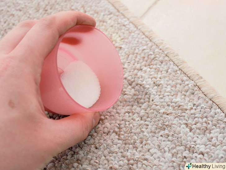 Насипте на пляму трохи харчової соди і залиште її на п'ять хвилин. харчова сода відома своєю здатністю вступати в хімічні реакції. Насипте на забруднену ділянку трохи харчової соди: вона послабить силу зчеплення між жиром або маслом і поверхнею килима, і Вам буде легше видалити бруд. [7]- Замість соди в даному випадку можна використовувати крохмаль.