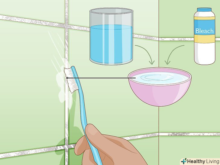Протріть цемент водним розчином відбілювача. якщо в душі є цементні поверхні (наприклад, місця стику плитки), очистіть їх змоченою відбілювачем щіткою. Змішайте дві частини води і одну частину відбілювача і протріть отриманим розчином поверхню цементу. [11]- Використовуйте для цього стару зубну щітку.