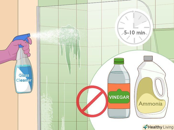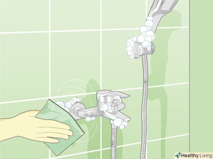 Нанесіть миючий засіб на першу секцію. зачекайте 5-10 хвилин, поки воно подіє (якщо тільки на упаковці не вказано інший час). [7]- Переконайтеся, що миючий засіб підходить для того матеріалу, з якого зроблений душ. Наприклад, не використовуйте кислоти (оцет, нашатирний спирт або звичайні чистячі засоби для ванни) для чищення мармуру. У цьому випадку виберіть спеціальні засоби для мармуру.