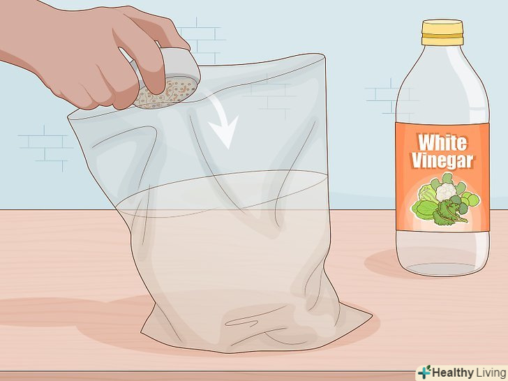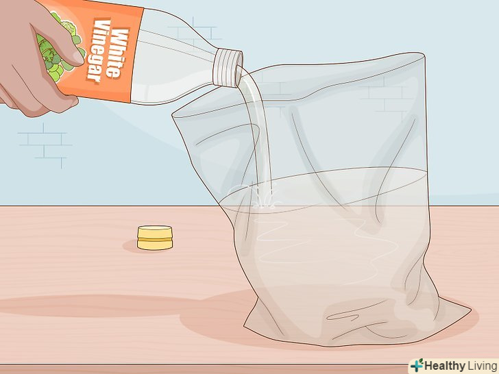 Візьміть чотирилітровий пакет з щільного поліетилену і залийте в нього білий оцет. кількість оцту залежить від розмірів душового розпилювача. Знадобиться стільки оцту, щоб він покрив ту сторону розпилювача, звідки ллється вода. [13]- Підійде будь-який пластиковий пакет, але краще взяти пакет з щільного поліетилену, щоб він не протікав.
