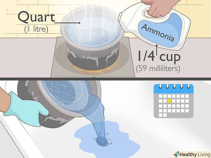 - Приготуйте власне засіб для чищення: змішайте 1 склянку (240 мілілітрів) оцту, 1/2 склянки (90 грамів) харчової соди, 1 стакан (240 мілілітрів) нашатирного спирту і 5,5 літра гарячої води.