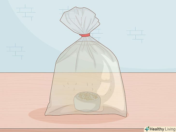 Перев'яжіть верх пакета досить великою гумкою. обтягніть гумкою пакет і верхню частину розпилювача, щоб його нижня поверхня, з якої виливається вода, залишалася повністю зануреною в оцет. [15]- Якщо у вас немає підходящої гумки, можна зав'язати пакет чимось іншим.