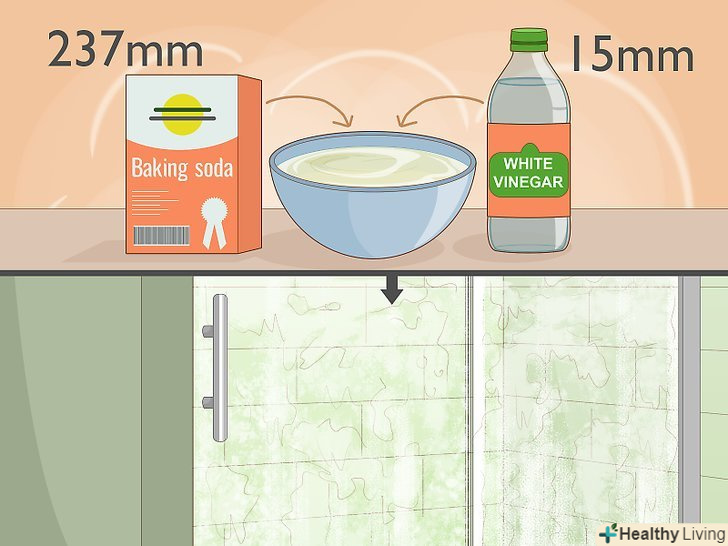 Нанесіть миючий засіб. можна використовувати покупне засіб або зробити його самому. Щоб приготувати натуральний засіб для чищення, візьміть склянку (180 грамів) харчової соди і додайте в нього 1 столову ложку (15 мілілітрів) білого оцту. Нанесіть суміш на душові двері. [18]