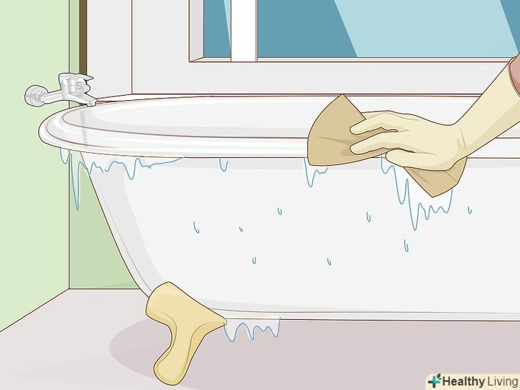 Відкрийте двері у ванну кімнату. якщо в ній є вікно, відкрийте і його, щоб як слід провітрити приміщення. Чистячі засоби можуть бути небезпечними при вдиханні, тому вийдіть з ванної кімнати, якщо відчуєте легке запаморочення або нудоту. [5]- Якщо у ванній є вентилятор, увімкніть його, щоб краще провітрити кімнату.