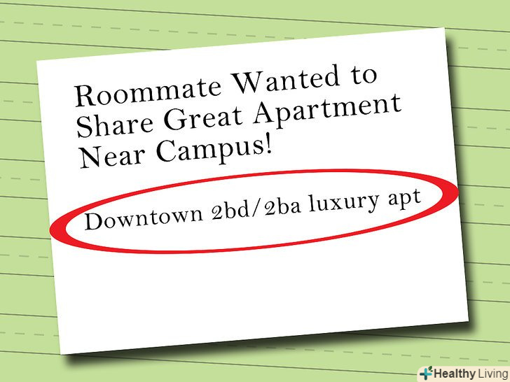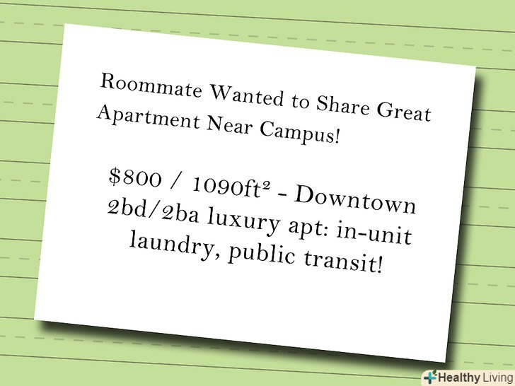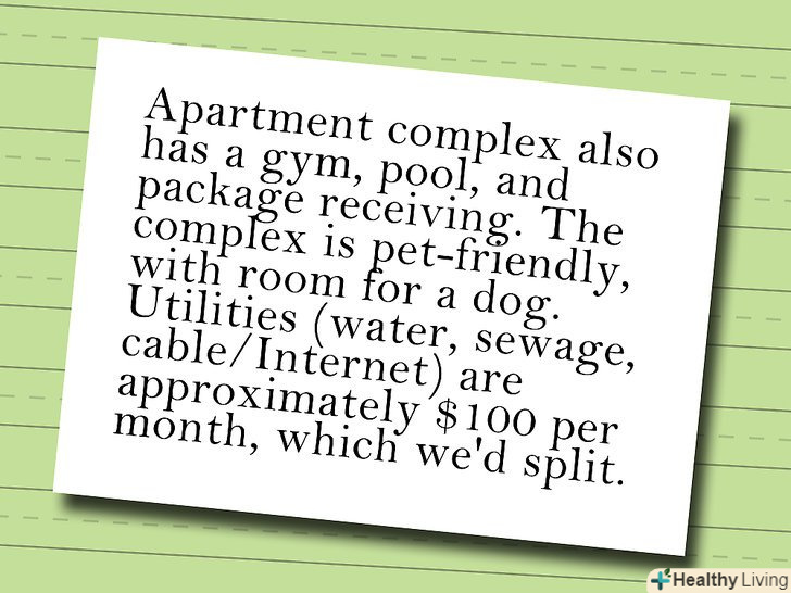 Рекламуйте квартиру потенційному сусідові. Перерахуйте переваги самої квартири, житлового комплексу і навколишньої місцевості. Вам потрібно подумати про речі, які можуть сподобатися тому типу сусіда, який ви шукаєте. Наприклад, якщо ви шукаєте сусіда спокійного і старанного, вам потрібно згадати щось типу «розташована у відокремленому місці, тихому в нічний час, ідеально підходить для людей, які намагаються уникати галасливого вуличного руху».
