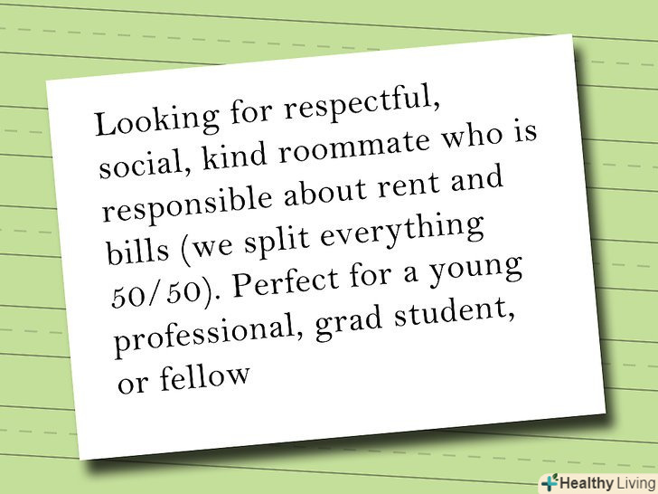 Напишіть, який тип сусіда ви шукаєте. хоч і може здатися, ніби ви прискіпливі, сенс оголошення в тому, щоб залучити тип орендаря, з яким вам би хотілося жити. Перерахуйте особливості, наприклад некурящий, Чоловік або жінка, а також інші характеристики, як спокійний або охайний, які можуть бути важливі для вас.