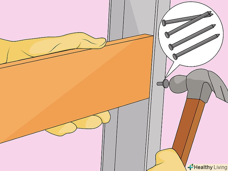 - Встановіть в дверний отвір дерев'яні брусочки розміром 2x4 дюйма (5 см x 10 см), що б вони легко рухалися всередині профілю. Це зміцнює дверний отвір і сприяє кращому кріпленню дверних петель. Крім того, стіни не будуть трястися, коли ваша дитина сильно грюкне дверима.