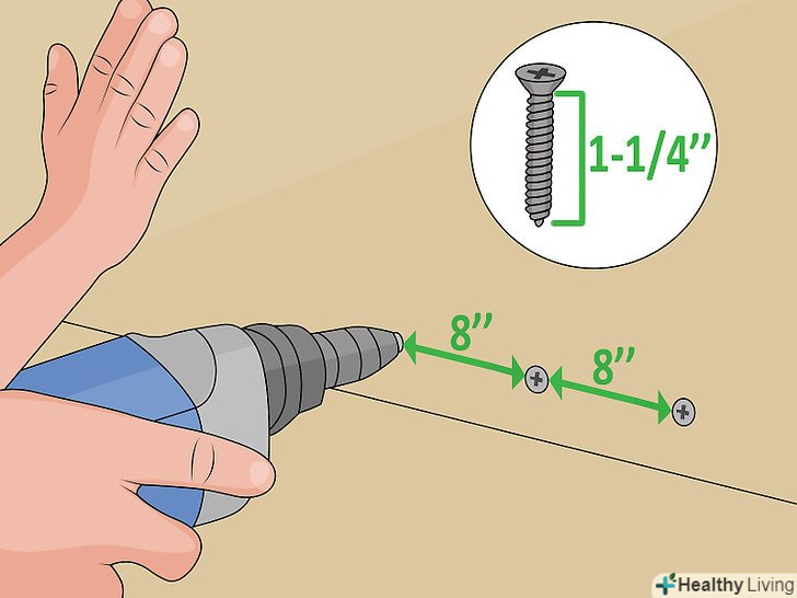 Обшийте конструкцію гіпсокартоном, використовуючи саморізи розміром 1-1 / 4 дюймів. саморізи повинні бути вкручені через кожні 8 дюймів (на стиках двох листів гіпсокартону), і 12 дюймів (30,5 см) на решті площі листа.- Уточніть стандарти. Можливо, потрібно, щоб саморізи були на більш близькій відстані один від одного, і нехай краще їх буде більше, ніж ви будете додавати їх, коли прийде перевіряючий.