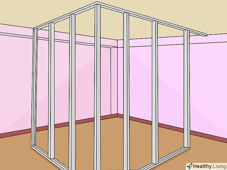 Встановіть профіль короткою стороною до підлоги. використовуйте лінії, відмічені крейдою, які вказують на розташування нижнього профілю, а також на отвори, потім прикріпіть профіль саморізами. Якщо потрібно пркрепіть до бетону, використовуйте перфоратор.- Встановлюючи профіль, рівно притуляйте кути по відношенню один одному. Зафіксуйте кути профілю, так щоб вони не ковзали. Довгий профіль кріпиться саморізами через кожні 6 дюймів (15 см.).