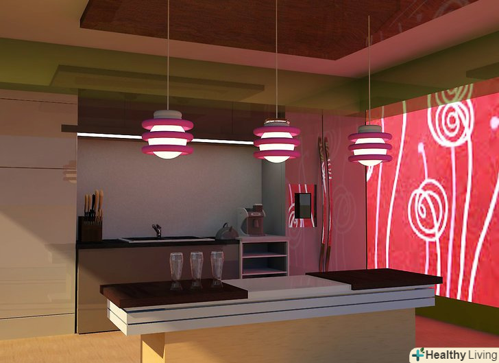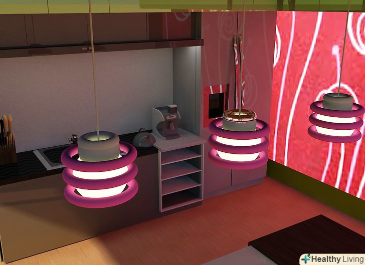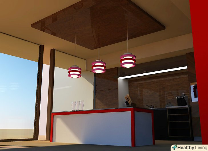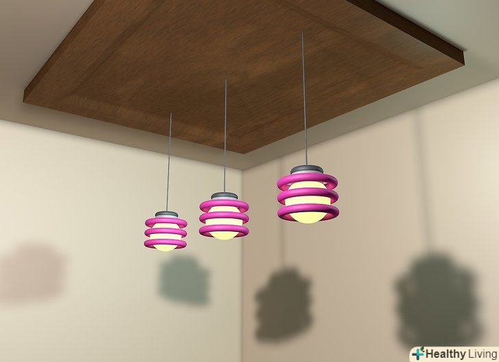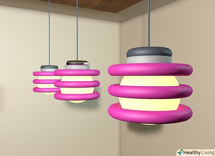 - Розрахуйте, враховуючи висоту стелі. Якщо стеля має висоту в 2,4 метра, тоді стельова лампа повинна висіти на 30-50 см нижче. На кожні додаткові 30 сантиметрів стелі, додавайте лампі 7,5 сантиметра.