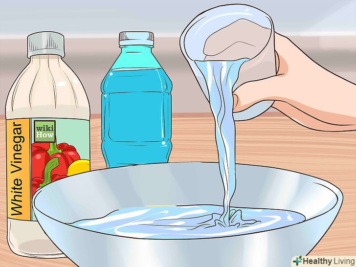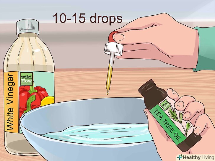 Приготуйте розчин самостійно. змішайте в мисці 10-15 крапель олії лимона або чайного дерева з двома склянками (480 мл) білого оцту. Перемішайте розчин, щоб змішати масло і оцет. [10]- Саморобний розчин можна замінити магазинним кондиціонером для шкіри. Перш ніж застосовувати засіб, обов'язково звіртеся з інструкцією на його упаковці.