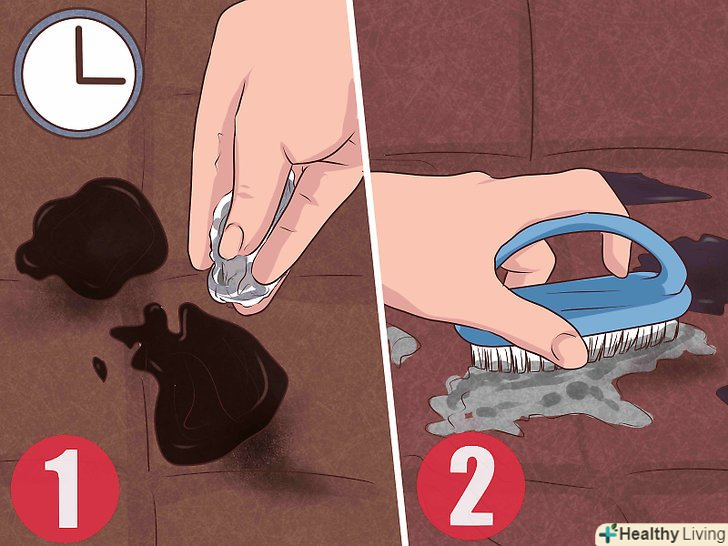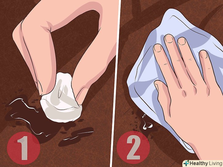 Видаліть розливи. іноді на шкіряний диван проливаються такі напої, як кава, чай або червоне вино. Подібні розливи слід негайно витирати і не давати їм висихати на поверхні шкіри. Після видалення рідини акуратно протріть диван миючим засобом для шкіри. Не забудьте потім повністю висушити поверхню шкіри сухою ганчіркою. [8]- Обробіть темні плями на світлій шкірі. змішайте рівні частини лимона і винного каменю для обробки плями. Нанесіть суміш на пляму і залиште на 10 хвилин. Протріть суміш вологою ганчіркою, а потім протріть шкіру чистою тканиною. [9]