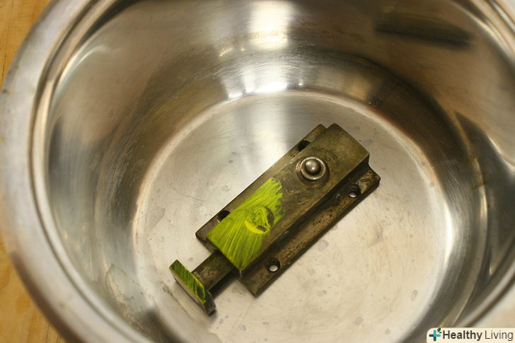 Увімкніть пальник на повільному вогні, щоб оцет поступово закипів. фарба почне розм'якшуватися і відокремиться через кілька хвилин. Якщо частини не з твердої латуні, то довго не кип'ятіть їх; оцет почне розчиняти латунь в тих місцях, які стерлися від частого використання (наприклад віконні ручки при відкриванні віконної рами).