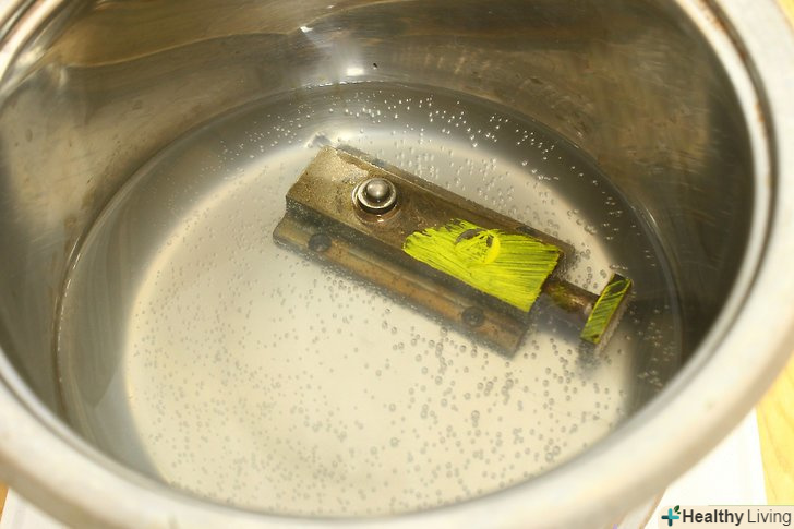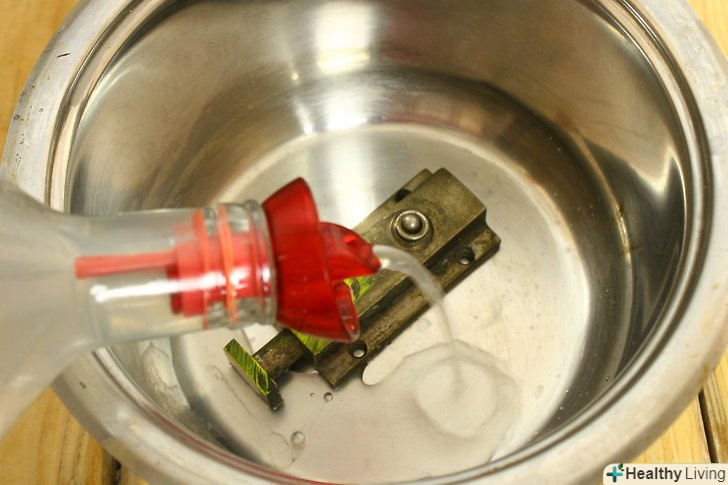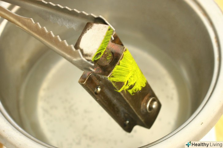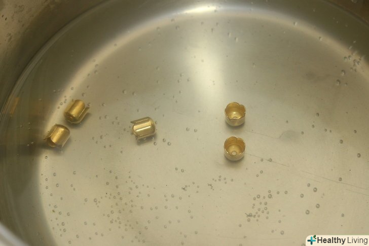Покладіть одночасно кілька виробів в стару миску, яка вам більше не стане в нагоді. [Миска не повинна бути алюмінієвою. Підійде миска з порцеляни, нержавіючої сталі або скла. Не відомо, як алюміній буде реагувати з оцтом і латунню.] Поставте каструлю на пальник плити, на електричну пальник або електроплитку, яку Ви можете підключити на відкритому повітрі або в добре вентильованому гаражі.