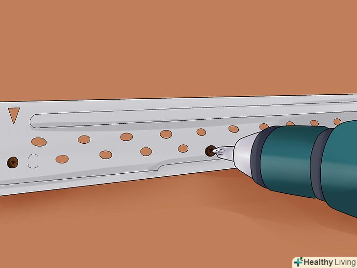 Закріпіть монтажну пластину. вам знадобиться помічник, щоб утримувати монтажну пластину в потрібному положенні при кріпленні.- Закріпіть пластину каретними гвинтами в отворах діаметром 5 мм.дані гвинти будуть нести основну вагу мікрохвильової печі, тому необхідно кріпити ці гвинти на каркасних балках.