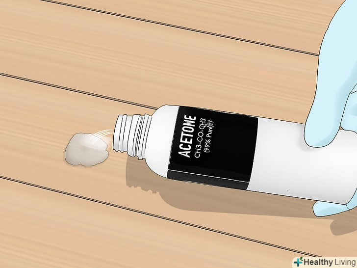 Нанесіть на поверхню ацетон. Якщо епоксидна смола пристала до дерев'яної поверхні, змочіть її ацетоном і почекайте принаймні годину, поки він вбереться, і смола розм'якшиться. Можна занурити предмет в ацетон, або змочити їм поверхню смоли. При цьому ацетон вбереться в деревину. [2]- Якщо епоксидна смола пристала до пластику, мармуру, цементу, вінілу або металу, будь-яка хімічна речовина буде діяти лише на поверхню, не проникаючи всередину, як це відбувається в разі деревини.