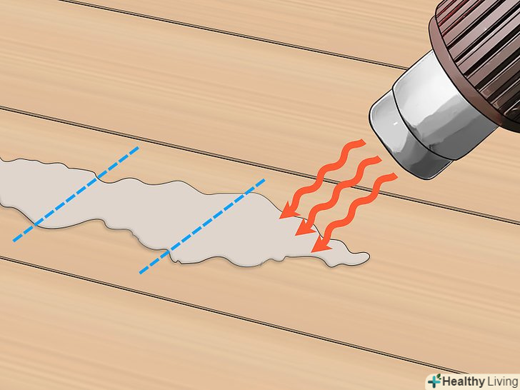 Отлепите нагріту смолу. щоб видалити епоксидну смолу з поверхні, скористайтеся ножем, лезом або іншим гострим предметом. При цьому може виявитися, що смола не прогрілася на всю глибину. В такому випадку знову розігрійте її, продовжуючи віддирати до тих пір, поки не видалите повністю. [6]- Не розігрівайте епоксидну смолу повторно відразу ж після попереднього нагрівання. Зачекайте кілька хвилин, давши смолі охолонути, перш ніж нагрівати її повторно, оскільки в іншому випадку поверхня може перегрітися, і тоді виникне загроза пожежі.