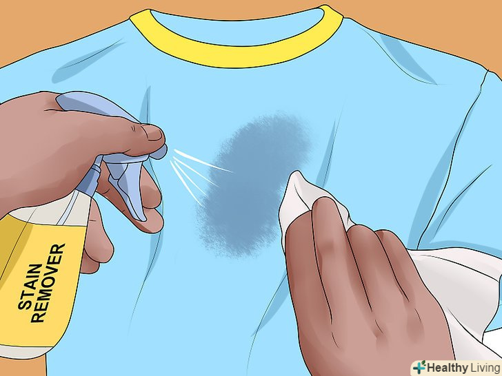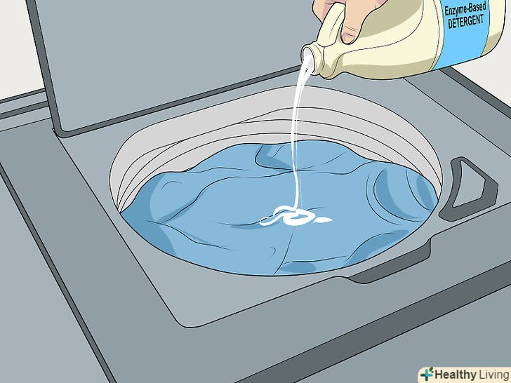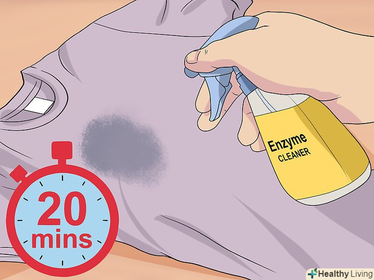 Замочіть одяг на 20 хвилин в розчині для попередньої обробки. використовуйте ферментний очищувач, звичайний засіб для виведення плям або невелику кількість рідини для миття посуду. Одного з цих розчинів буде достатньо для виведення плями. За 20 хвилин до прання нанесіть очищувач на пляму, щоб воно їм просочилося. [5]- Перш ніж приступити до обробки, протестуйте розчин на непомітній ділянці одягу, щоб перевірити її на стійкість кольору.