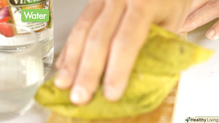 - Нейтралізуйте відбілювач розчином білого оцту і води в рівних пропорціях (50:50). після того як ви нанесете відбілювач, змішайте рівні частини білого оцту і води. Візьміть чисту губку і нанесіть розчин на поверхню так само, як ви робили з відбілювачем — це допоможе нейтралізувати суміш відбілювачів. [9]